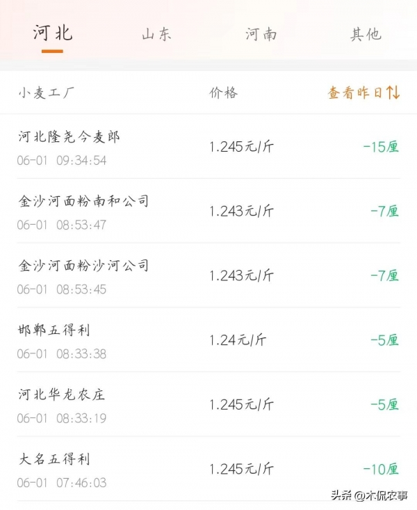 河北小麦市场今天多以下调为主,小麦收购企业基本下调的幅度在10-30元/吨,价格范围区间在1.24元-1.26元/斤,一般小麦渠道商下村拉粮报价在1.21元/斤左右(水分14%干粮)!河北隆尧今麦郎下调15厘,小麦收购价格:1.245元/斤;金沙河面粉南和公司下调7厘,小麦收购价格:1.243元/斤;金沙河面粉沙河公司下调7厘,小麦收购价格:1.243元/斤;邯郸五得利下调5厘,小麦收购价格:1.24元/斤;河北华龙农庄下调15厘,小麦收购价格:1.245元/斤;大名五得利下调5厘,小麦收购价格:1.245元/斤。
