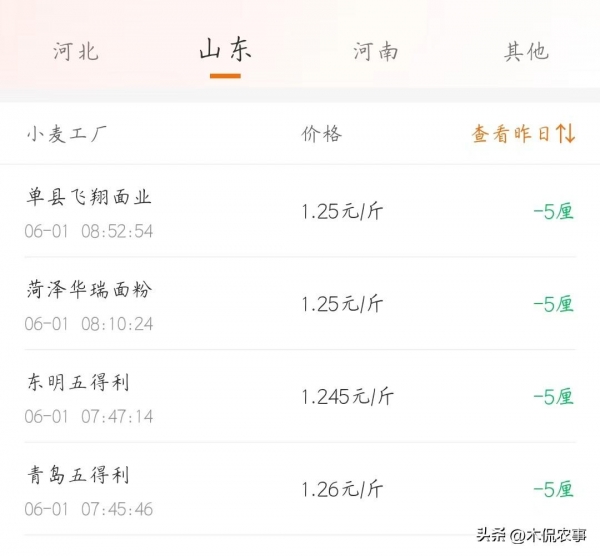 山东地区小麦收购企业均下调收购价5厘,小麦深加工企业收购报价在1.25元/斤左右。一般小麦渠道商下村拉粮报价在1.213元/斤左右(水分14%干粮)!单县飞翔面业下调5厘,小麦收购价格:1.25元/斤;菏泽华瑞面粉下调5厘,小麦收购价格:1.25元/斤;东明五得利下调5厘,小麦收购价格:1.245元/斤;青岛五得利下调5厘,小麦收购价格:1.26元/斤。