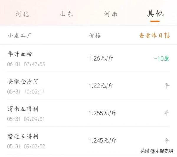 江苏地地区华升面粉下调10厘,小麦收购价格是1.26元/斤。