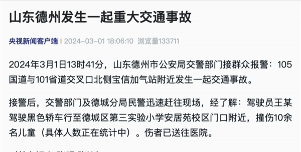 2024年3月1日13时41分,山东德州市公安局交警部门接群众报警:105国道与101省道交叉口北侧宝信加气站附近发生一起交通事故。