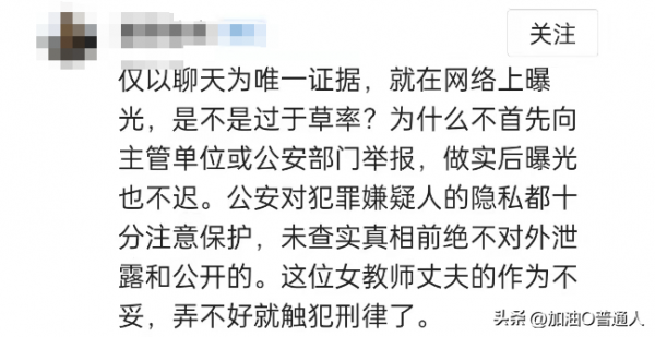 也有网友说:"丈夫应该向相关单位举报,经过调查后由相关部门公布,而不是直接在网上公布,这样的做法容易给当事人及其家庭成员带来困扰,不太妥当。"