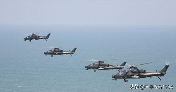 厦金海域出现了解放军陆军的直-10武装直升机,轰鸣着在进行超低空飞行。武直-10的突击力量强大,携带的机载"红箭"系列空地导弹,对海打击能力极强,并能实施跨海作战。