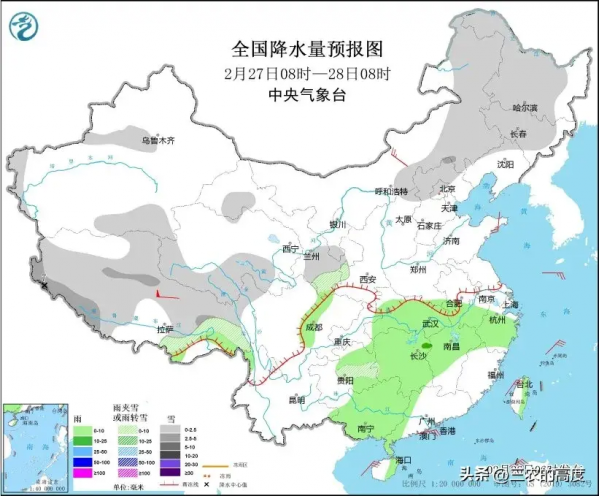根据最新的的气象预报预计,2月27日08时至28日08时,在我国西南地区的东南部、江汉的大部、江淮的西部、江南的大部、华南的西部等地的部分地区,预计有小到中雨。在内蒙古的东部、东北地区的大部、新疆的南疆、西藏的大部、青海的南部、甘肃的中东部、宁夏的南部、华北的北部等地的部分地区,预计有小到中雪或雨夹雪,局地有大雪。