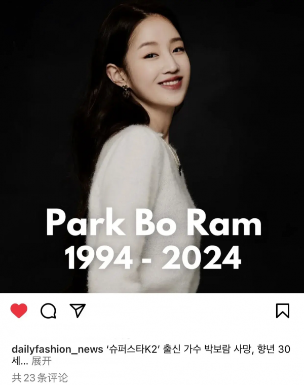 4月12日,韩媒那边传来了一个噩耗,歌手朴宝蓝去世,享年30岁。随后她的经纪公司证实:"朴宝蓝在4月11日深夜离开,葬礼程序将与遗属商议后举行。为了陷入悲伤的遗属及同事们,恳请大家不要进行推测性报道。"