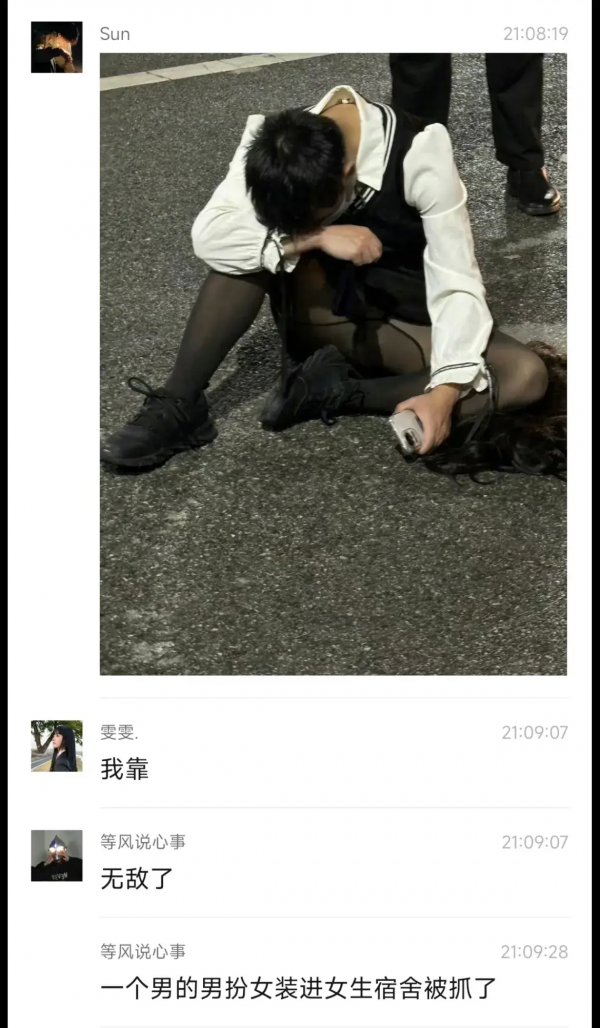 有人表示,去搀扶的女生估计一辈子都有阴影了。不反对现在的男生穿女装,但是变装用于溜进女寝室去偷拍,这就犯法了。现在这种变态行为越来越多了,真不知道他要偷拍什么。这种行为让人觉得恶心。