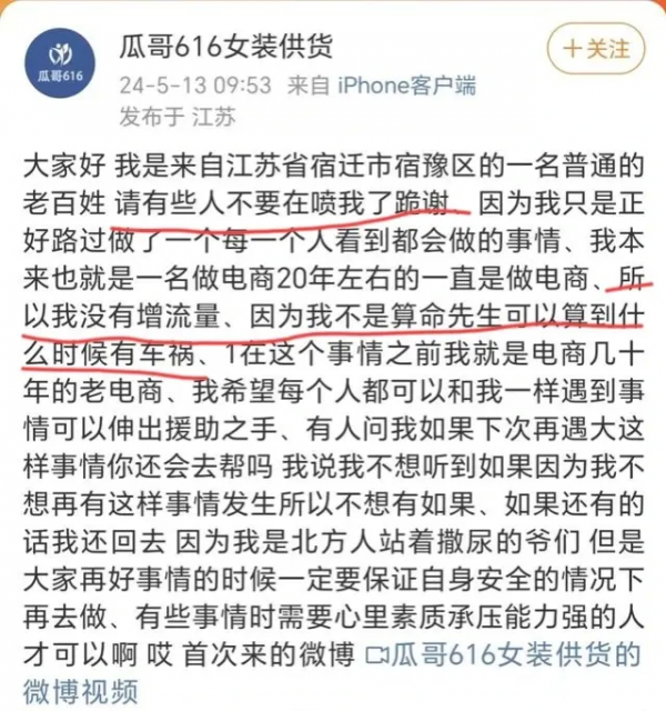 5月13日,这位大哥终于忍受不了,在微博上发声:"请求各位网友不要再喷我了,我只是做了每一个路过的人都会做的事情,我不是博取流量,我的承受能力真的不强!"他的声音中充满了无奈和痛苦,明明是善意之举,却被恶意揣测和攻击。