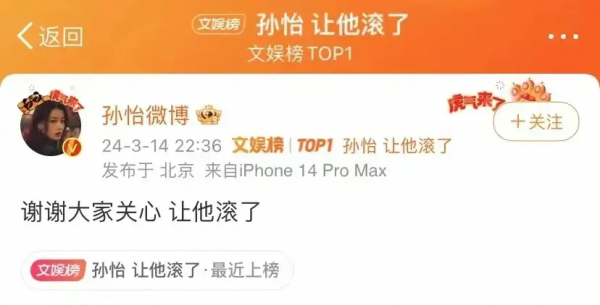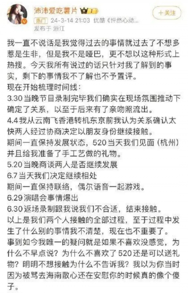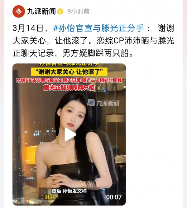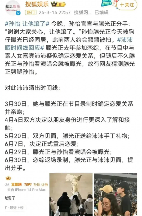 3月14日知名女演员孙怡刚被狗仔爆出和腾光正同居,紧跟着沛沛爆出她和藤光正的交往时间表和聊天记录,随后孙怡发文官宣分手!