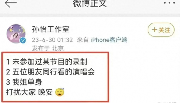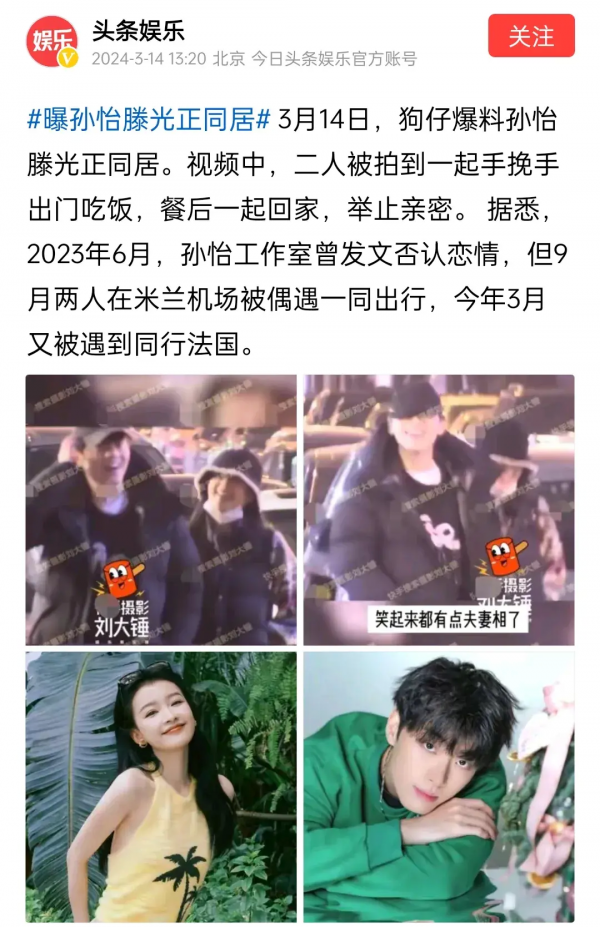 根据3月14日媒体爆料,假如孙怡真的是已经和腾光正同居,那么她们认识多久确认关系的成了问题?要知道孙怡离婚也没多久!而根据孙怡工作室发文看,2023年6月30日时还是单身!