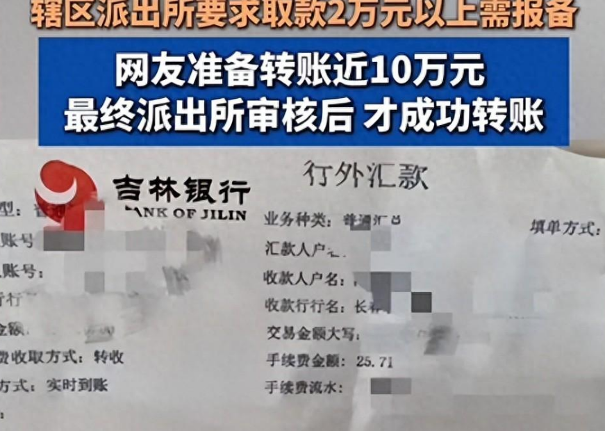 据该网友描述。当时他想从银行卡上取款近10万元。但工作人员对他说"取款2万以上需要先征得当地派出所的同意"。一开始。网友以为是工作人员开了个玩笑。但对方依然字字斟酌重复了这一要求。