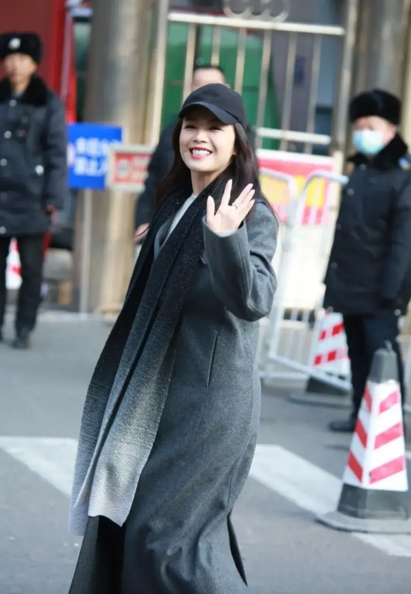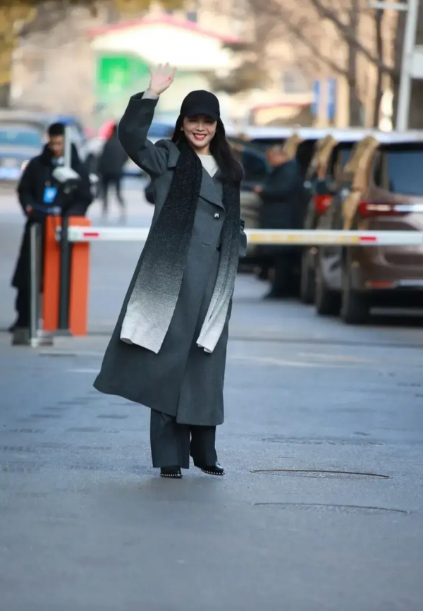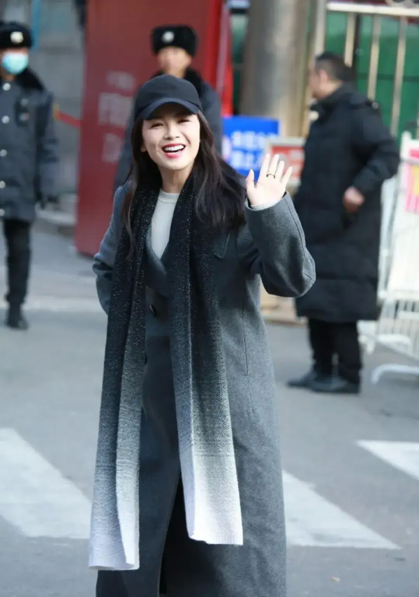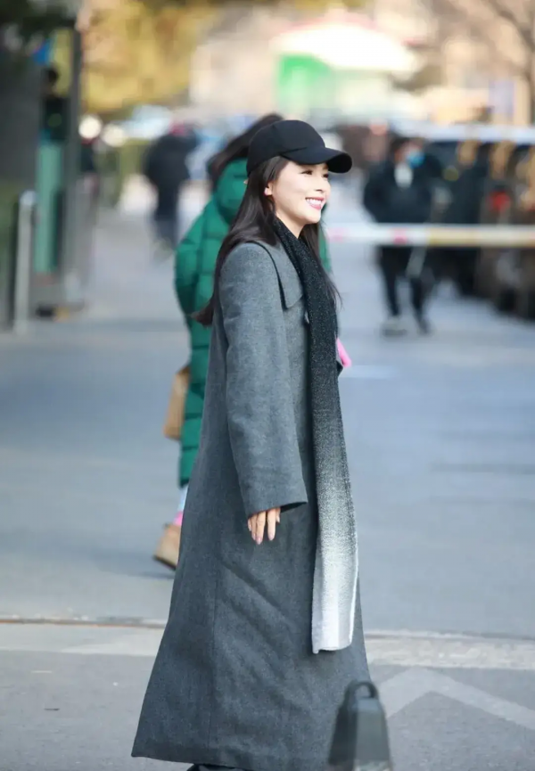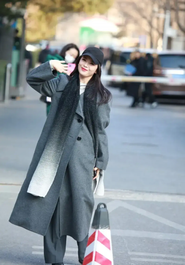 刘涛的内搭是一件白色毛衣,与外层的灰色大衣相搭配,给人一种简洁而优雅的印象。这种色彩搭配突显出她的气质和品味。脖子上系着的渐变风格围巾为整个造型增添了一份独特的魅力,使她在寒风中依然显得风度翩翩。