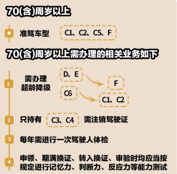 在老年人年龄达到70周岁时,原来的D、E驾驶证需要办理超龄降级,降级为F驾驶证,同时原来的D、E驾驶证的准驾车型也不能继续驾驶,违规的话就会受到相应的处罚。
