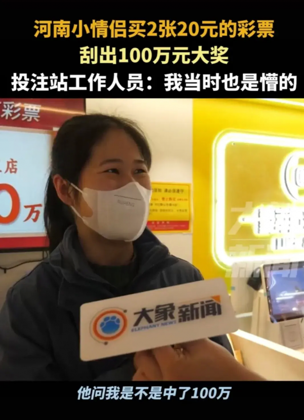 根据工作人员介绍,这对情侣在中奖时应该发出声音,工作人员听到后以为是小奖,等到情侣拿过去给她看时才发现是100万元的大奖。