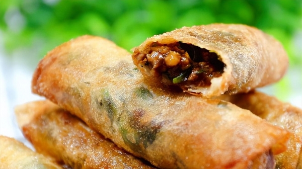 4. 将春卷放入热油中炸至金黄色,直到外皮酥脆。