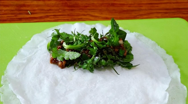 3. 取一张春卷皮,将馅料放在皮的一端,再放入洗净的荠菜,然后卷起来,封口处抹上一些水淀粉糊。