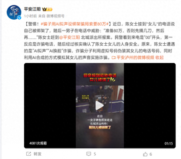IT之家 1 月 25 日消息,据平安江阳今日通报,近日四川江阳一名女子险些遭遇新型电信诈骗,诈骗分子利用虚拟号码伪装其女儿的电话号码,并利用 AI 合成的方式模拟她女儿的声音实施诈骗。警方最终确认其女儿的人身安全,并没有被绑架,这名女子险些被骗走 80 万元。