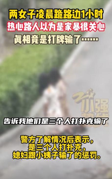 当事人是一位成熟男子,面对民警的走访表示:"罚跪的是他的妻子和小姨子,三人在家玩扑克,约定谁输了就去小区花坛罚跪。"