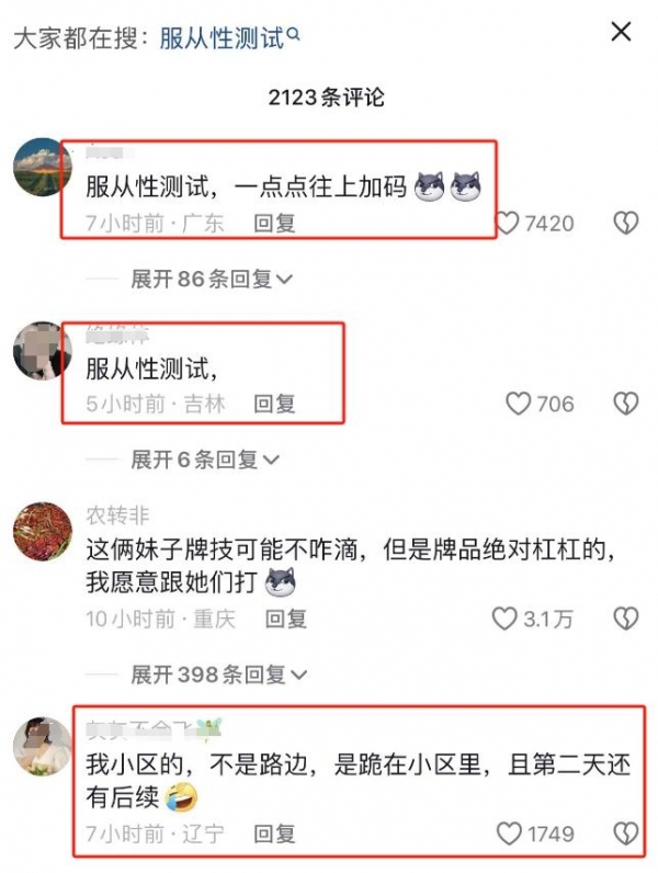 有网友在评论区说,"这一看就是那个小众圈子里的,懂得都懂,就是在做服从性测试,俩女孩被毁了"。