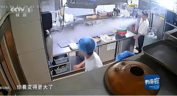 雷长群结合当时厨房的监控画面讲解说:"这个时候液化气已经喷出来了,这几名师傅不知道去疏散人,而是在这里把时间白白给错过了。"