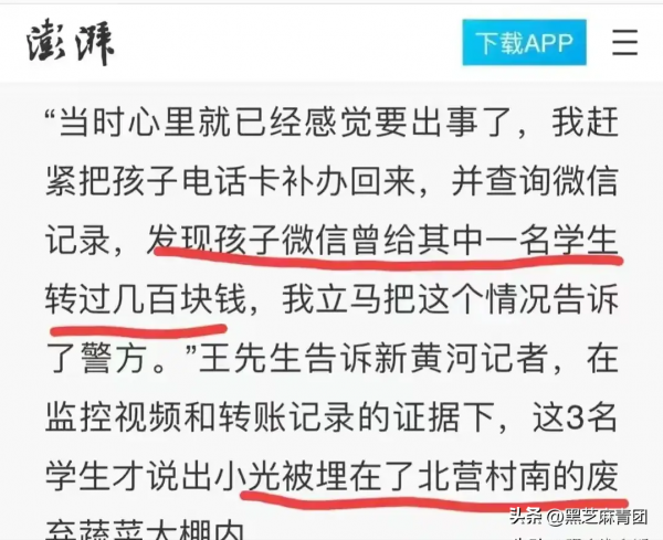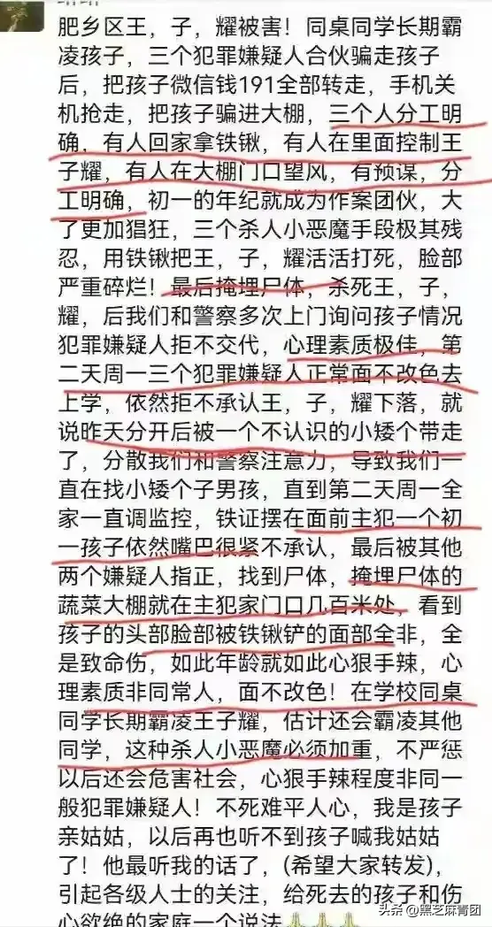 一名叫王子耀的13岁初中生,被三名同班同学诱骗至一处废弃蔬菜大棚里残忍杀害,并将其手机里的191块钱全部转走。