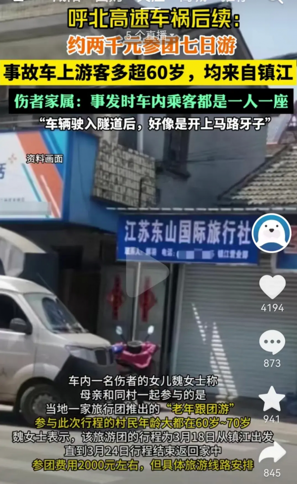 后来据大巴内幸存游客回忆:这是当地旅行团推出的"老年跟团游"约2000元参团7日游,此次参团的村民年龄都在60~70岁左右,车上共有61人,都是一人一座,3月18日从镇江出发,3月24日结束返回。