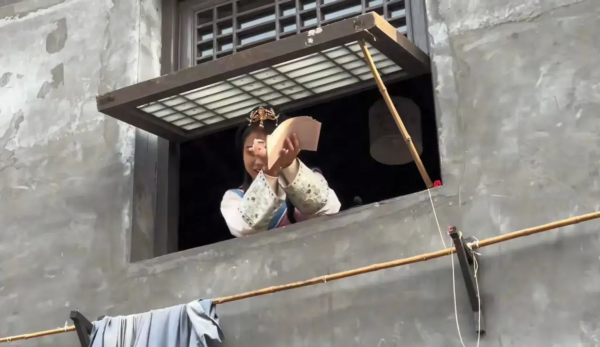 这栋小房子户型不大却有两层高,二楼用木头制成的窗棂被两根木棍撑了起来,一位女性工作人员穿着古装站在窗前,映入了他的眼帘里。