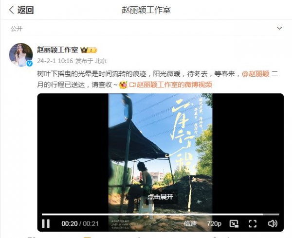 2024年2月1日,赵丽颖工作室也依旧卡在了10:16分的时候,更新了一条视频,并为此配文:"树叶下摇曳的光晕是时间流转的痕迹,阳光微暖,待冬去,等春来,@赵丽颖 二月的行程已送达,请查收~",这也受到了网友们的广泛关注。