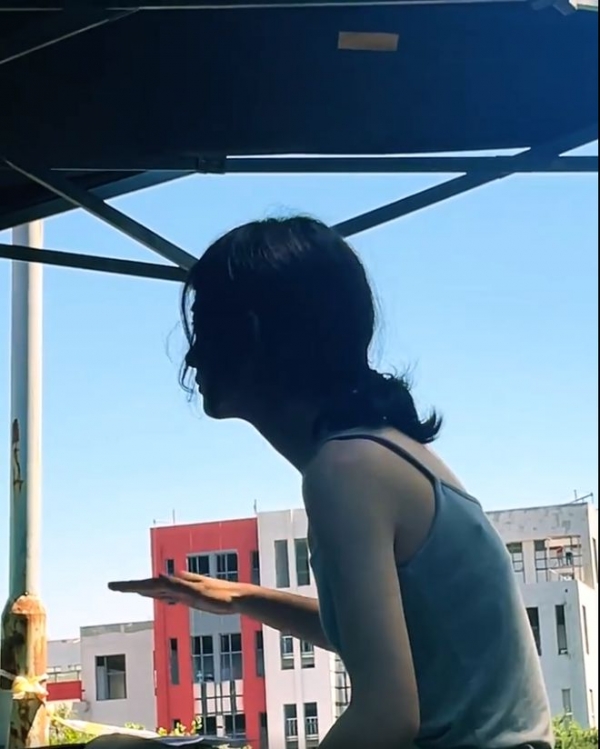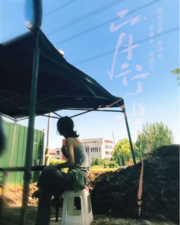 在炎炎夏日,赵丽颖也依旧十分的敬业,在简易的遮阳伞下方,坐在一把塑料凳子上,翘着二郎腿,认真的研读着剧本,手还不停的比划着动作,而身旁的环境也与这样的美人儿在一起时,却也显得有些格格不入了。