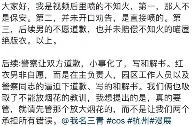 "我名三青"告诉海报新闻记者,双方在报警后经警察调解已写和解书,朋友的衣服是绝版cos服装,经灭火器喷洒后已损坏,但该男子不但未提赔偿一事,反而扬言要起诉自己与朋友。"我朋友现在准备在主办方陪同下去医院检查身体,目前只想要道歉和赔偿,若该男子起诉,我们也会用法律武器保护好自己。""我名三青"说。
