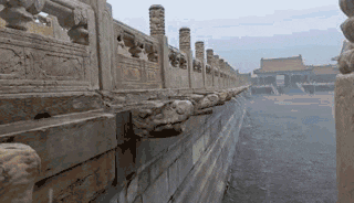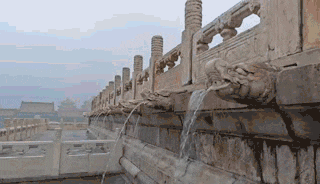 屋顶上,凸起的筒瓦与凹陷的板瓦组成"排水通道"--瓦垄。从天而降的雨水,沿着一道道瓦垄有序流下,在屋檐的滴水处汇集,流至地面。宫墙内侧的殿檐积水,则顺着排水口排出墙外。大殿台基的上千个螭首,也尽责地将积水"吐"至地面。无数条水流沿着地面的钱眼、沟槽漏入下水沟道,最终全部排入内金水河,完成又一次流动的循环。
