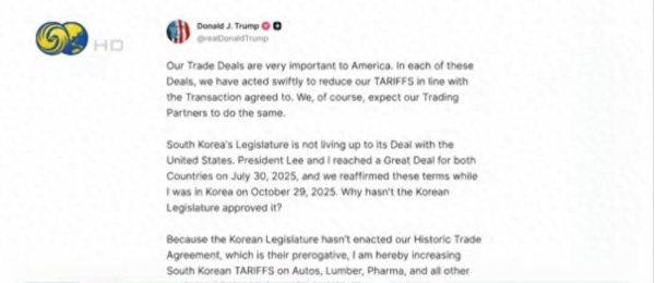 美国总统特朗普26日在社交媒体上表示,由于韩国国会尚未履行此前美韩达成的贸易协议,将把韩国进口汽车、木材、药品等商品的对等关税税率由15%上调至25%。