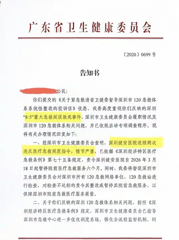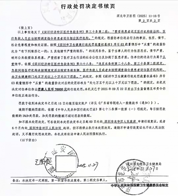 2025年11月27日,龙华区卫健局对健安医院罚款7.6万、暂停院前急救资质半年,家属认为处罚过轻,已申请行政复议。