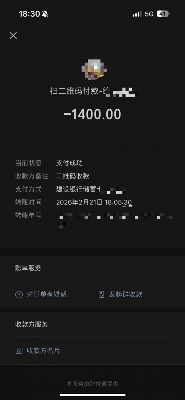 1400元拖车费用支付记录。图/受访者提供