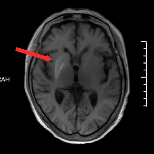 头颅磁共振(MRI)检查显示一个关键线索,在影像上可以看到,孙奶奶右侧大脑豆状核区域显示出异常高信号,而在其他序列中该区域并无明显异常。这一特异性影像表现,引起了放射科主任陈子虎的高度重视。