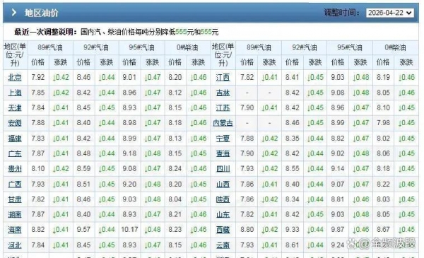 国内油价终于迎来了今年真正意义上的降价。4 月 21 日晚上 24 点,新一轮成品油调价正式落地,92 号汽油每升下调 0.44 元,95 号汽油每升下调 0.46 元,0 号柴油每升下调 0.45 元,整体跌幅已经快要接近每升 0.5 元。
