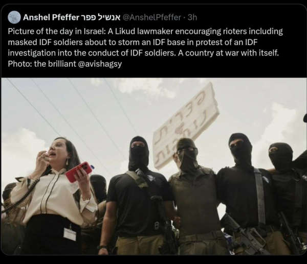极右翼的那些人打砸军营,社交媒体上各种相关照片和视频都有。之前有报道说,由于现场没警察,以军从加沙前线撤回至少第933"纳哈尔"步兵旅的两个营,还从约旦河西岸调回一些部队,把原来的部署计划搅得一塌糊涂。以色列国防军还嘴硬说没从加沙撤出军队保护基地,但也承认骚乱损害了以色列安全。