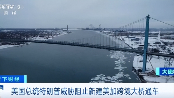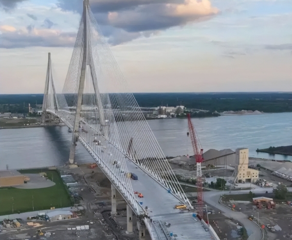 这座大桥横跨底特律河,一头连着美国密歇根州底特律,一头连着加拿大安大略省温莎市。2018年开工,耗资约47亿美元,全部由加拿大联邦政府出资。原计划今年通车,建成后将成为美加边境最大的陆路口岸。