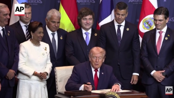 《金融时报》称,在多拉尔,特朗普签署了一项建立"美洲之盾"的宣言,阿根廷、玻利维亚、哥斯达黎加、多米尼加、厄瓜多尔、萨尔瓦多、圭亚那、洪都拉斯、巴拿马、巴拉圭、特立尼达和多巴哥的领导人以及智利当选总统都在他身边。
