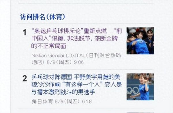 然而,在日本的新闻网站上,一条有关中国乒乓球的新闻登上了体育频道的热搜第一。