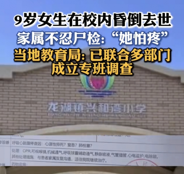 2025年12月30日早上,河南新郑市龙湖镇兴和湾小学,一名9岁四年级女孩在课堂写试卷时突然晕倒,经抢救无效去世,家属因"她怕疼"迟疑是否尸检,死因暂未最终确认。