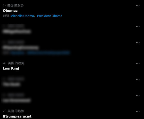 观察者网注意到,截至当地时间6日晚,舆论仍在社交媒体疯狂发酵,"奥巴马""狮子王""特朗普种族歧视"等相关词条继续"霸榜"X平台趋势榜。