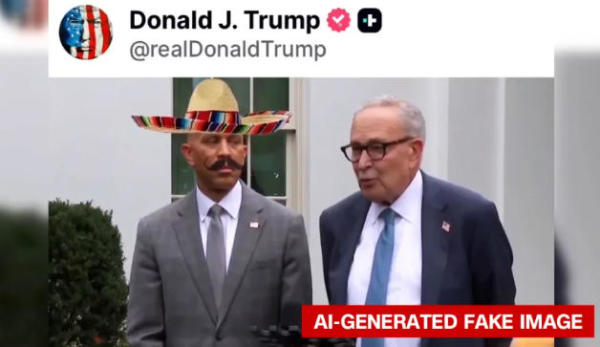 去年,特朗普曾发布AI视频,显示奥巴马在白宫椭圆形办公室被捕。特朗普及政府成员还分享AI图像和视频,给美国联邦众议院少数党(民主党)领袖哈基姆·杰弗里斯戴上假胡子、墨西哥帽。杰弗里斯系美国历史上首位领导国会主要政党的非裔美国人。当时,他抨击特朗普"种族主义"。