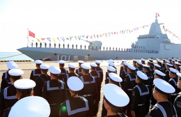 2020 年 1 月 12 日,中国人民解放军海军 055 型驱逐舰首舰南昌舰归建入列仪式在青岛某军港码头举行。新华社记者 李唐 摄