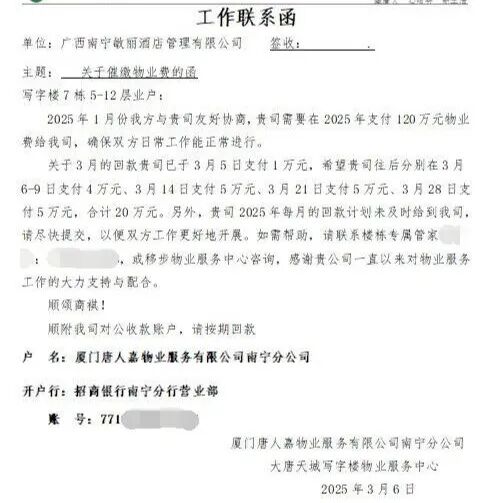 2025年3月,唐人嘉物业发函给酒店,要求全年交120万元物业费。按照5元/平方米收费,一年应交60万元物业费,偿还一年的物业欠费,吴经理认为这是物业方的约定,他们也认可,并按要求交费。