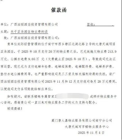 11月27日上午,记者联系上唐人嘉物业大唐天城写字楼物业服务中心的李主管,他解释称,亚朵北湖店目前还欠216万元物业费,他们是在清债,该酒店一直没有制订还款计划。物管方不存在锁电梯催收,是电梯坏了。至于2025年3月的工作函,并未盖章。李主管表示,会有公司新闻对接人正式回应,但截至记者发稿时,未收到任何回应。