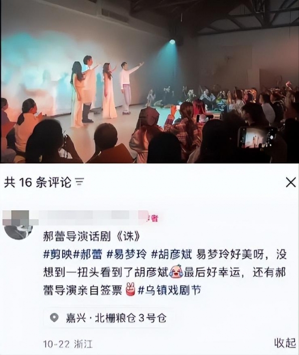据说今年10月底的时候,胡彦斌还出现在了易梦玲参演话剧的观众席。