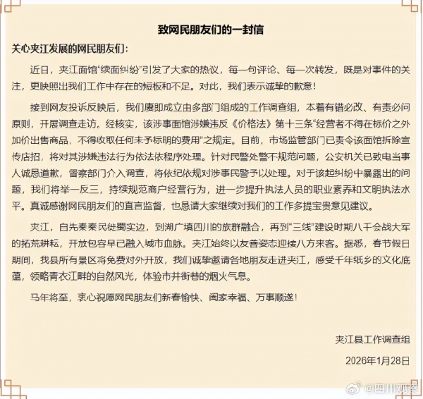 近日,夹江面馆"续面纠纷"引发了大家的热议,每一句评论、每一次转发,既是对事件的关注,更映照出我们工作中存在的短板和不足。对此,我们表示诚挚的歉意!
