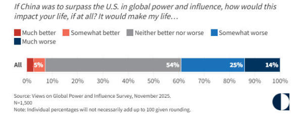 引人注目的是,有62%的受访者表示,"如果中国在实力上超过美国,他们的生活不会变得更糟"。只有14%认为会"严重恶化"。研究人员解读道:"这表明,很少美国人把中国超越美国视为灾难性事件,且公众不愿为此付出重大经济、军事或其他代价。"