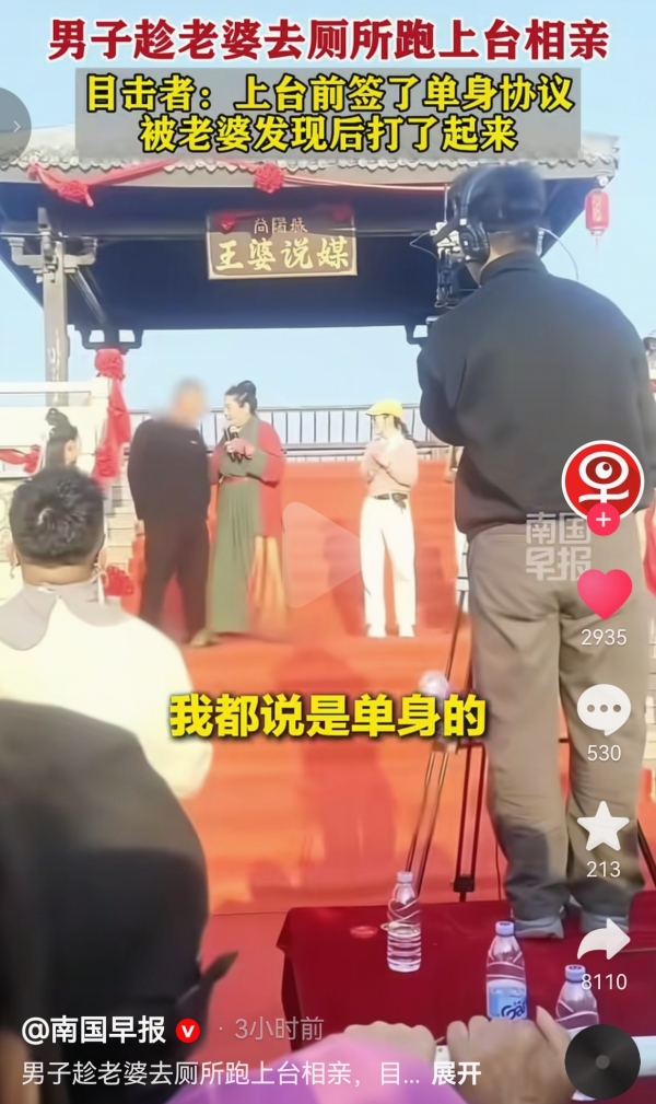 4月1日,安徽蚌埠。王婆说媒活动现场,一名51岁的男子趁妻子去洗手间,偷偷上台参与相亲,并签下单身协议。该男子在台上自称离异有两个孩子,被抓包后改口称"我不想要她,我没跟她结婚"。
