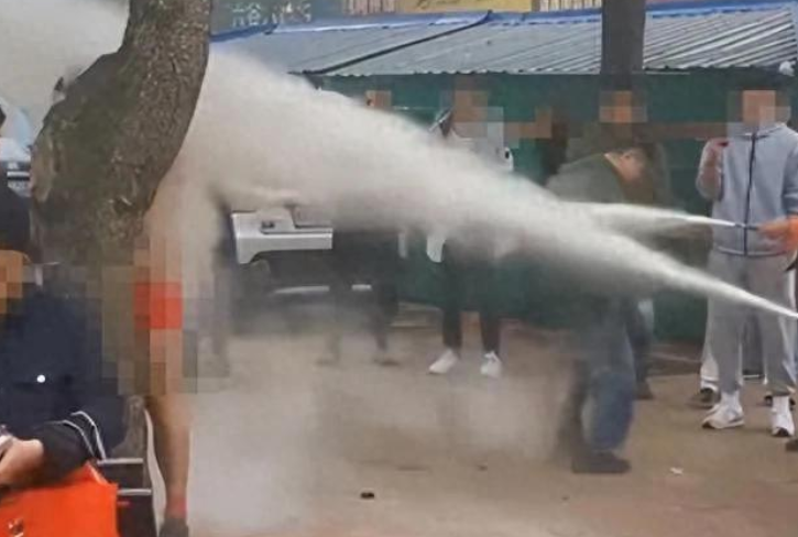 随后,有人手持灭火器,对准他猛烈喷射。白色干粉瞬间弥漫,新郎在呛人的烟雾中狼狈不堪,周围的人却举着手机,拍得不亦乐乎。