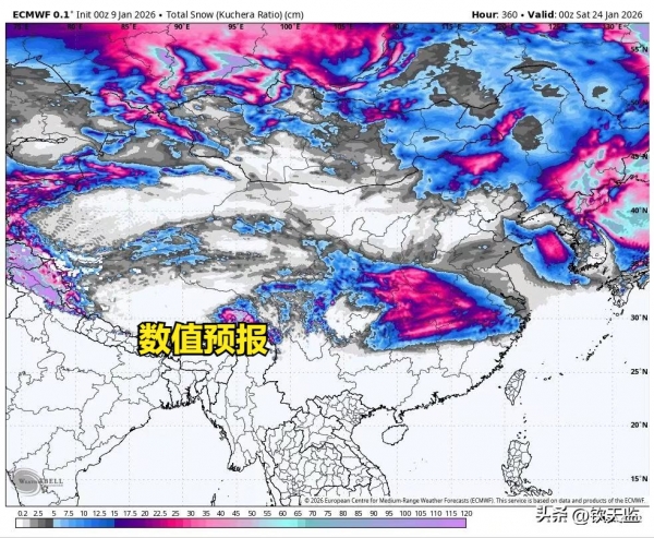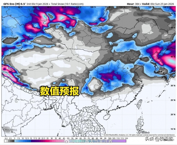 最新的数值认为1月中下旬西伯利亚一带被势力强大的极地高压占据,东亚地区呈现出西高东低的环流形势,乌拉尔暖脊、鄂霍次克海暖脊、西伯利亚大冷槽和强南支槽集体出动,导致冷暖气流活动都非常活跃并且配合度很高,因此欧美数值将中旬末下旬初的大范围强降雪进一步调强。